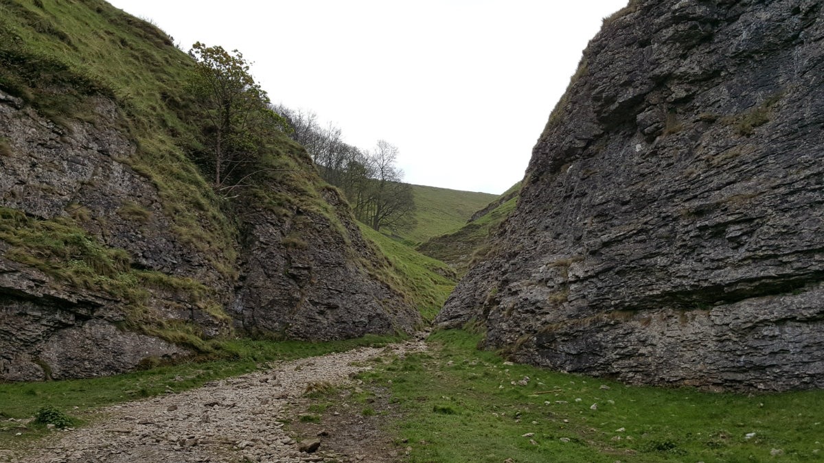The route now goes into White Peak area. Descend Mam Tor by the obvious path and at the road, turn left and through the gate. Descend through the field to meet the Winnats Pass road. Cross this road and through the gate to the track going to Rowter Farm. Follow this well made track until the crossroads [SK135813]. Here turn left, east, and follow the path towards Cave Dale, part of the Limestone Way. The path follows fields and then descends into Cave Dale itself. It is very tight in a number of places. The sides of the dale have some interesting features, holes, in the limestone rock. At the bottom is a gate that leads to Castleton. Follow through the streets to reach the car park. Note that the lower slopes of Cave Dale are often wet, and very slippy, even after a long dry spell. (5kms. 0m. 1hrs. 30min.)