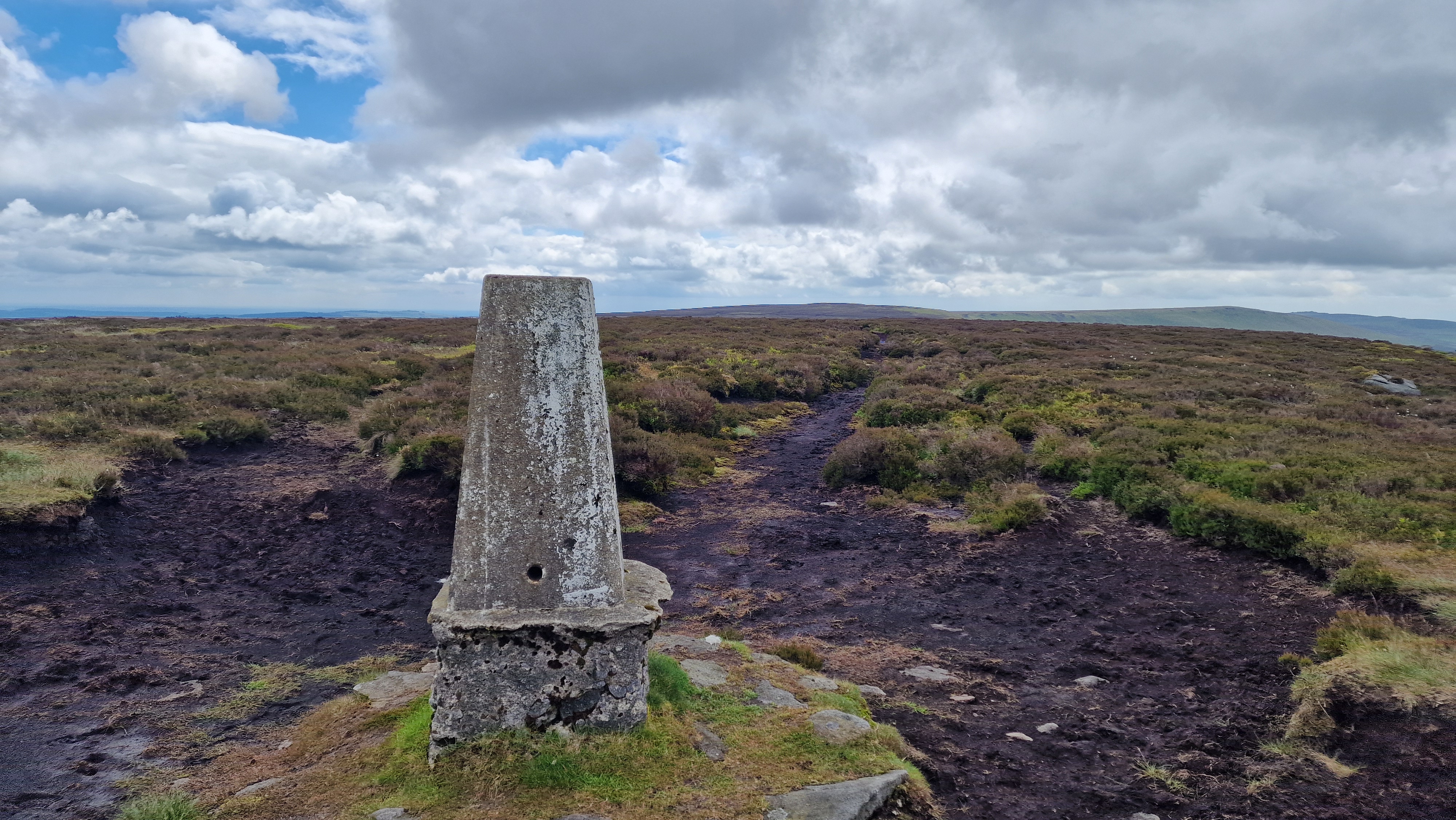 From the end of the road at Kings Tree, walk up the good track to slippery stones where the river is crossed by the packhorse bridge. Then follow the track along the Upper Derwent Valley to reach the start of the Cut Gate path at Cranberry Clough, marked with a sign. Follow the Cut Gate bridleway initially alongside the river then steeply up the hillside. Soon the angle relents, and it is a less steep walk to the skyline. There are a number of cairns at the top of this pass. Walk to the high point of the pass. From here turn north and the route to Outer Edge is then straight ahead. There ia a path marked on the map which can be followed on the ground although the initial route from Cut Gate is difficult to follow. Follow the faint path over the high ground. This can be wet after periods of wet weather. Jumping to avoid the worst of the wet patches may be in order. Soon the trig point of Outer Edge comes into view; make straight to the trig point. Take a look around at the summit which has views east over to urban Barnsley and Sheffield; south down to Margey Hill, High Stones and the Derwent Edge; west over to Bleaklow and north to see the trucks on the Woodhead Road. (4.5kms. 270m. 1hrs. 50min.)