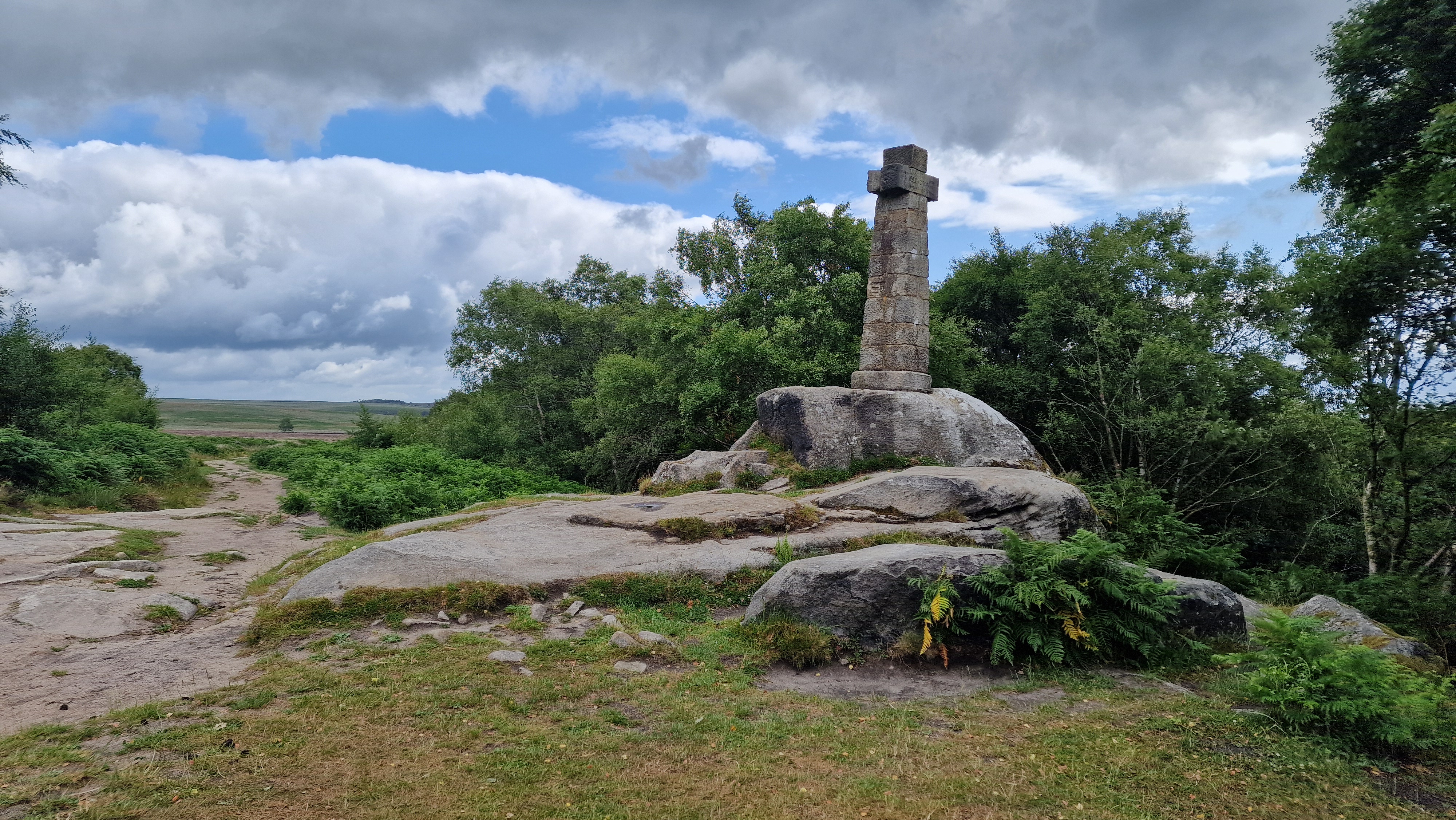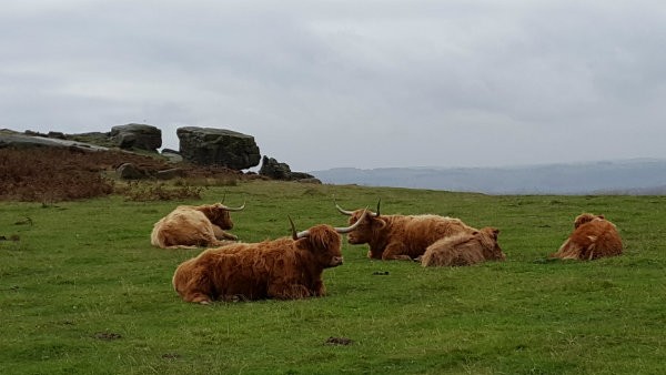 From the monument follow the significant track, east, to the minor road. Often a herd of highland cows can be seen grazing in this area. Cross the road and onto the fields opposite. There is a path from the road that crosses the rough ground before climbing up to the ridge of White Edge. This path is now followed along White Edge. It is worth the small diversion right to reach the trig point of White Edge. From here you can see the large moor to the east, Big Moor, home to a herd of Red Deer. White Edge gives a feeling of the high moor, a feeling of remoteness and in poor weather it is a much bleaker than the lower edges. (3.5kms. 100m. 1hrs. 20min.)