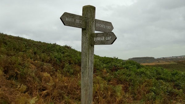 The trig point is not the true summit of White Edge. According to the latest OS map, the true top is point 366 (or 367 on the 1:50000 map!) some 500m north. Follow the along the path until opposite the high point and then walk over the heather and bilberry plants to reach the high point, perhaps using your phone to ensure you are really at the high point as marked. Look around and yes there is a mound maybe 100m away that is definitely higher! It is obvious that not many people visit this true summit. Walk back to the main path and follow it north along White Edge. At a wall, a significant signpost shows the way back to the Grouse Inn. This leads over a very wet and boggy field, best avoided. Keep walking north over White Edge Moor, to the small wood. Just short of the wood is a fence with a gate and through this gate there is a path that leads to White Edge Loge. Follow this path. Then follow the track that descends to the road. Take care here as the path on the ground does not match the path marked on the map. Once at the road, walk along the path on the side of the road a short distance to reach the Grouse Inn. (3.5kms. 40m. 1hrs. 10min.)