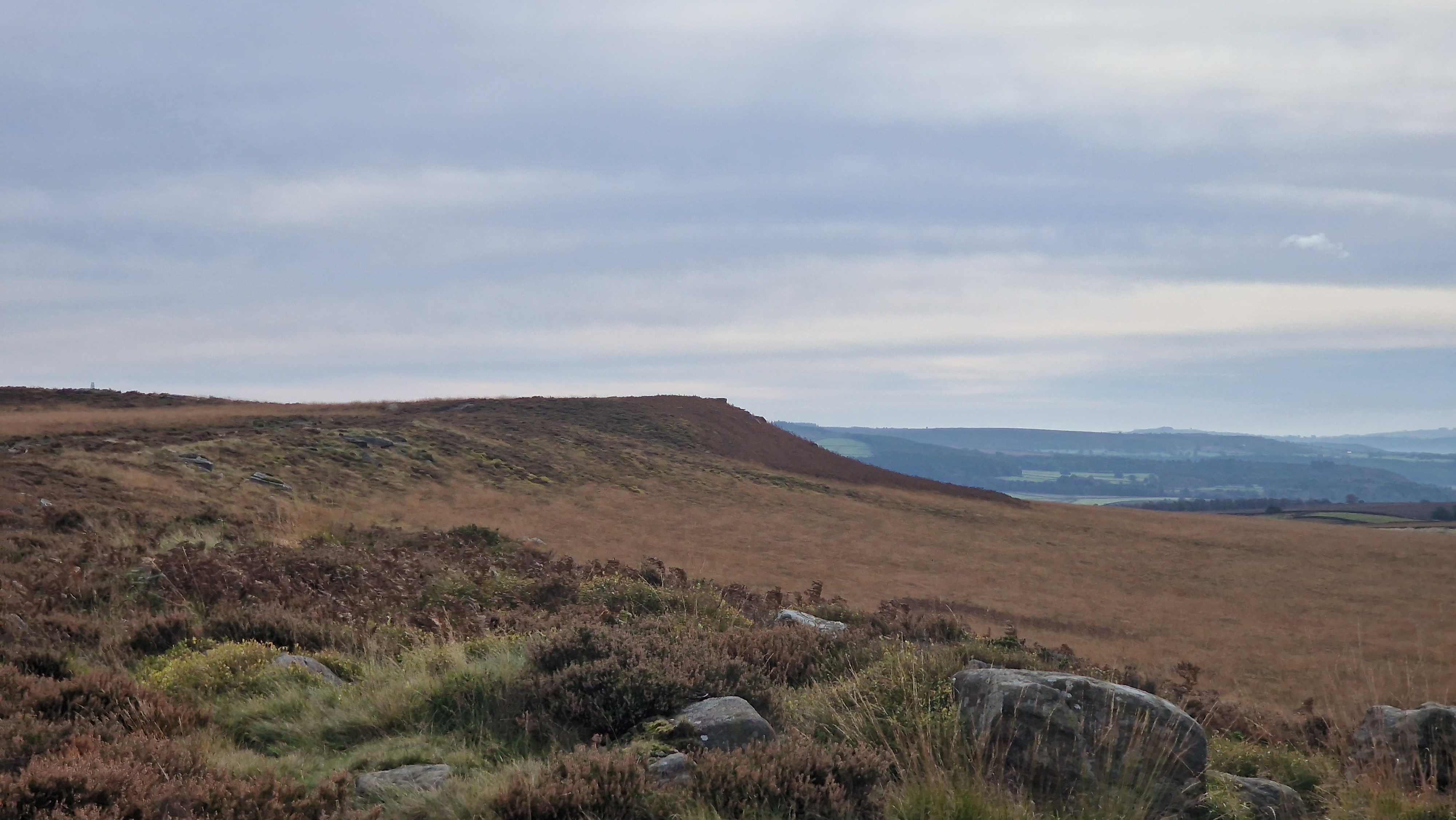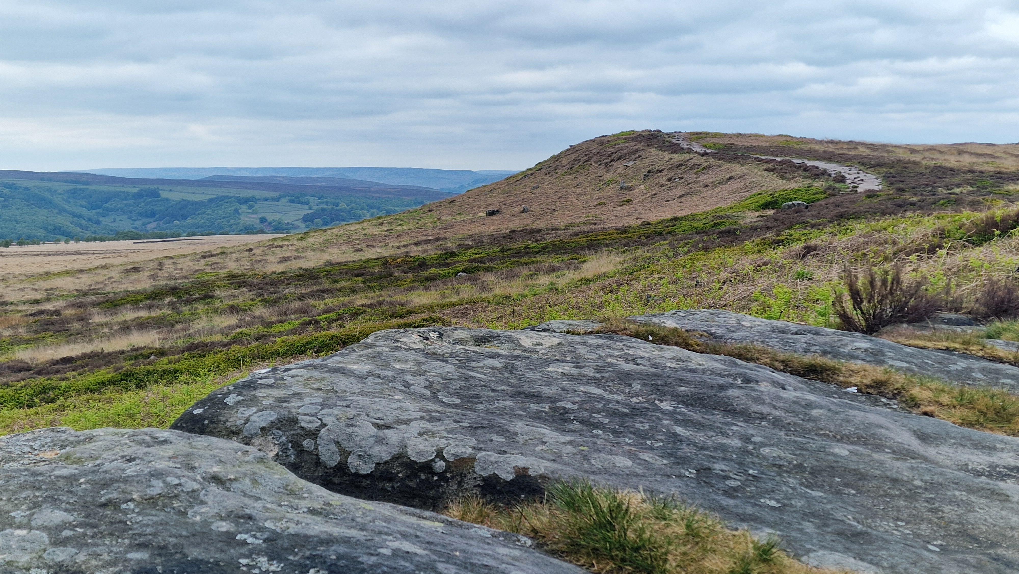 8th May 2025 White Edge sits above Froggatt and Curbar Edges. Today I walked from the road junction at the north and then up onto the edge and walked along the top to the White Edge trig point. The great advantage of White Edge is the panorama. Sadly not a blue sky day but still great views. A great afternoon walk on the eastern edges of the Peak District.