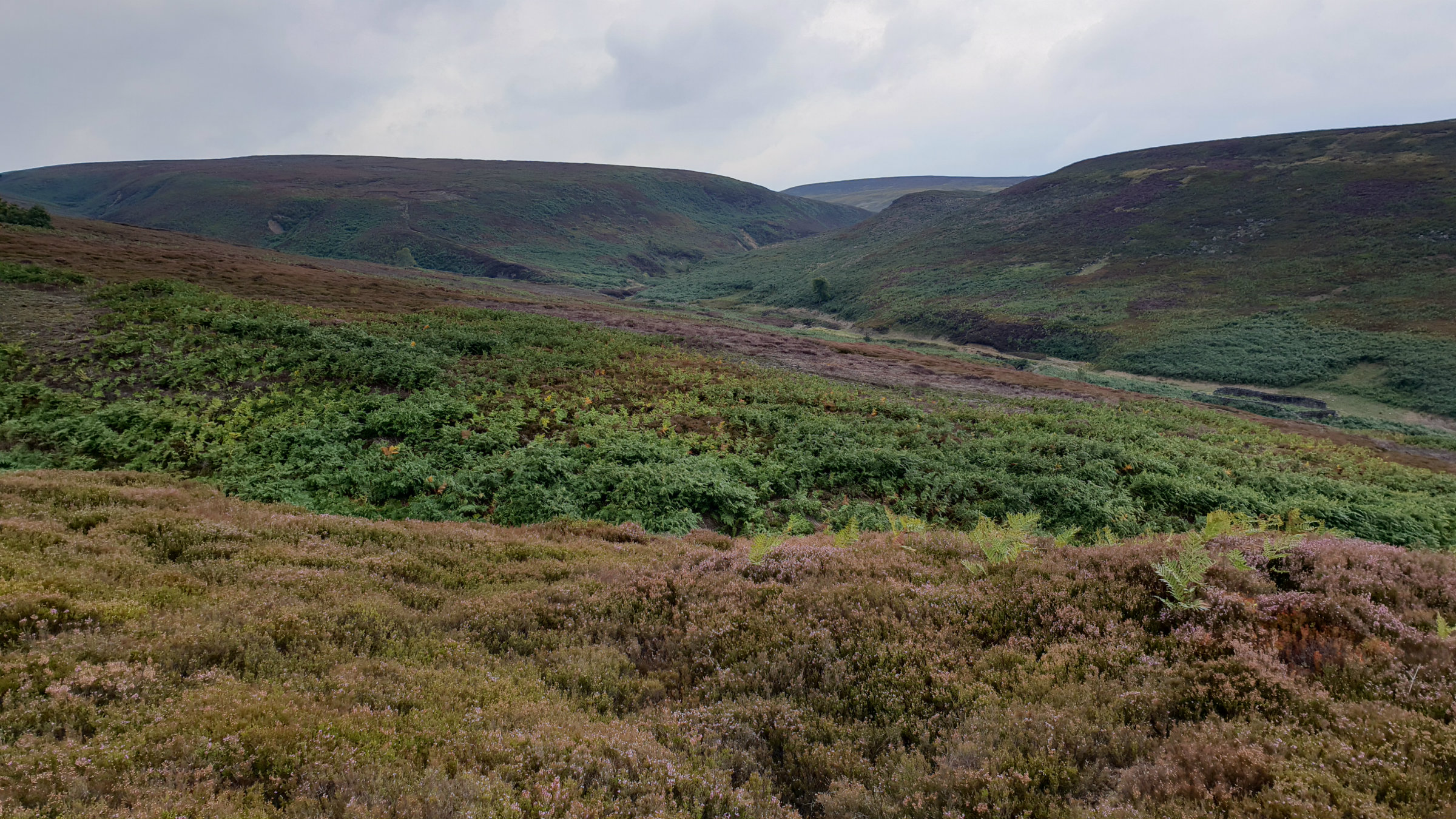 There is a sense of remoteness in this area of the Peak District. Away from the paths the moors can be challenging with the areas of heather, bracken and in particular peat. But the challenge is worth it with a great day out in the moors. The Woodhead pass is to the north and it seems perculiar to see the lorries pass over the distant moor on their way from Barnsley to Manchester. Cut gate is an old track climbing high over hills originaly used for travelling from South Yorkshire to Derbyshire. This route starts off up Cut Gate climbing to the top of the moors.