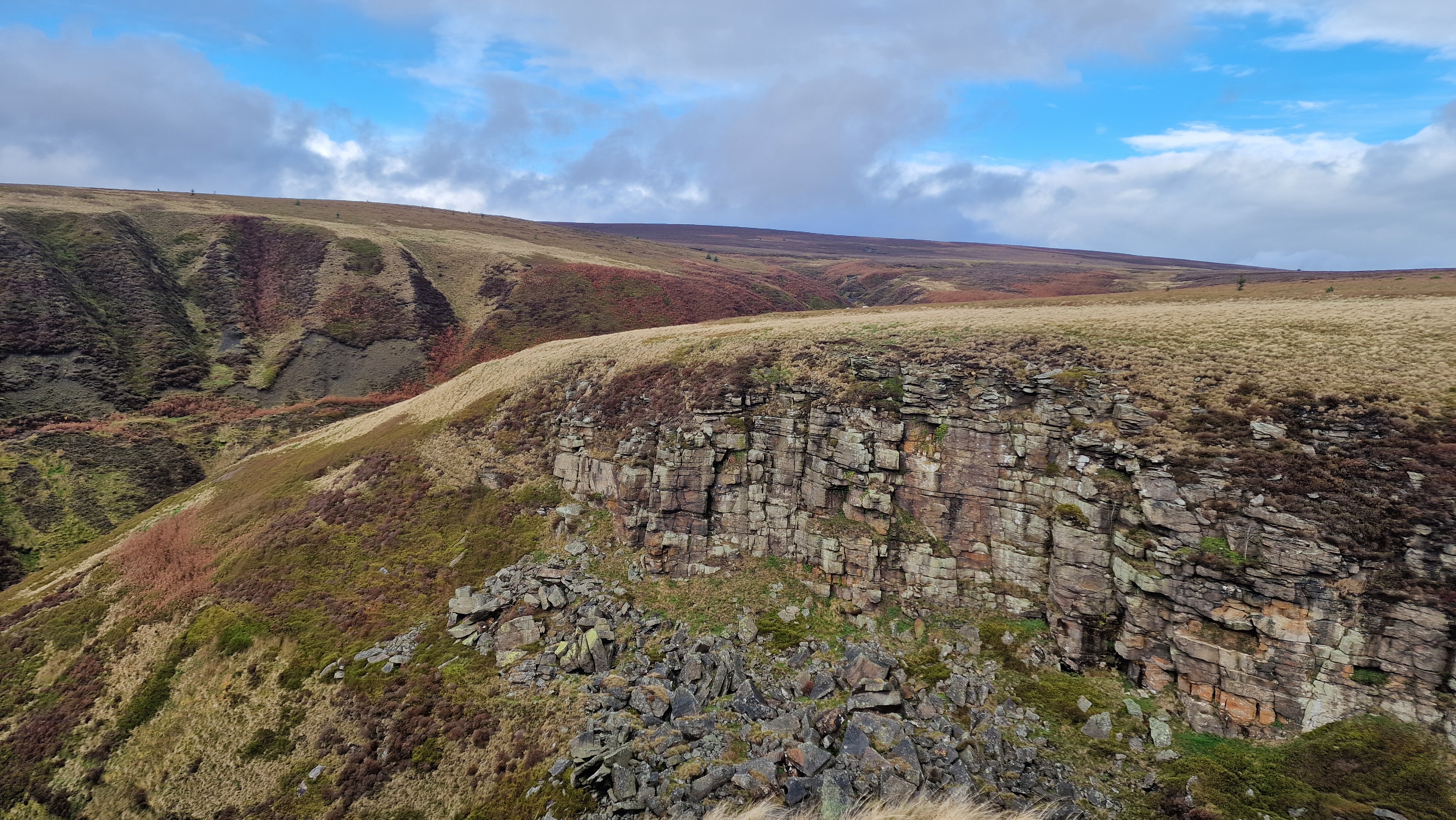 Leave Fairholms and follow the paths across the field in front of the Derwent Dam to the eastern corner. Ascend the steps here to reach the track that follows the eastern shore of Derwent reservoir. Follow this track for some 2km to reach the start of Abbey Brook. Just prior to a bridge there is a signposted route up the clough. Follow the track as it ascends to a gate and then onto the hillside. Just keep going until Sheepfold Clough is reached. It is possible to cut short the route here by walking up Sheepfold Clough to Back tor. This route now crosses Sheepfold Clough and follows the path along the direction of Abbey Brook. Just keep going as height is gained and the walker reaches the flat moorland that is Little Howden Moor. As you walk over the moor on the path, Cartledge Stones comes into view on the right. Continue along the line of Abbey Brook until a fence is seen that climbs the hillside to the west of Cartledge Stones. Again, this route can be shortened by walking up the eastern line of the fence to reach the height of Cartledge Rocks and then over to the path alon Cartledge Stones Ridge. Rather than taking the shortcut follow the path along the line of Abbey Clough, and then over the moor to reach Cartledge Stones Ridge further north than Cartledge Rocks. (8.0kms. 280m. 3hrs. 0min.)