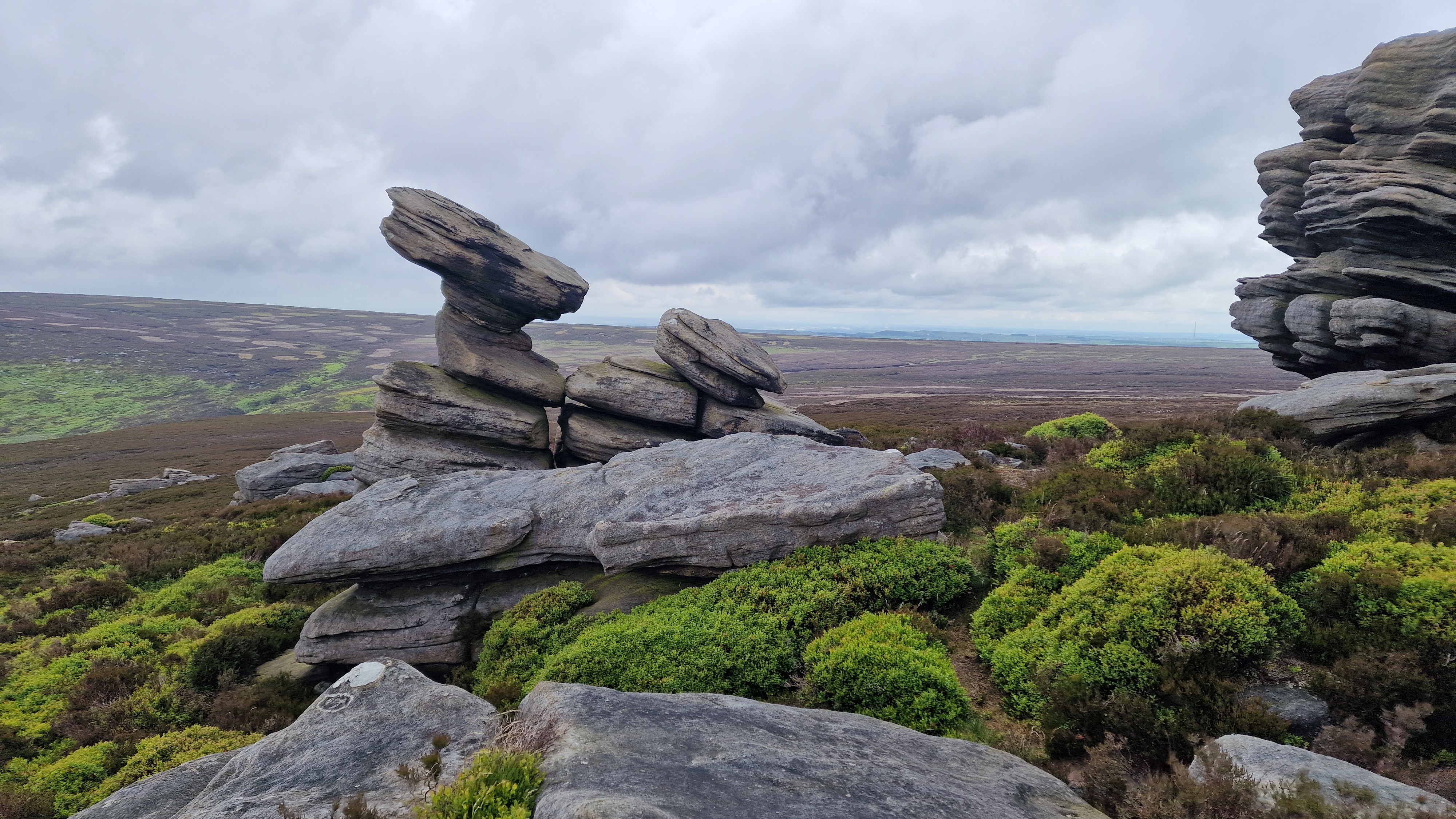 17th June 2024 This was an overcast day but turned sunnier giving great views once Outer Edge was reached. The rocks at Crow Stones, Rocking Stones and Bull Stones are much more significant than they appear from a distance. Indeed the height of Rocking Stones can support some decent rock climbing. Nobody about in the hills this day.