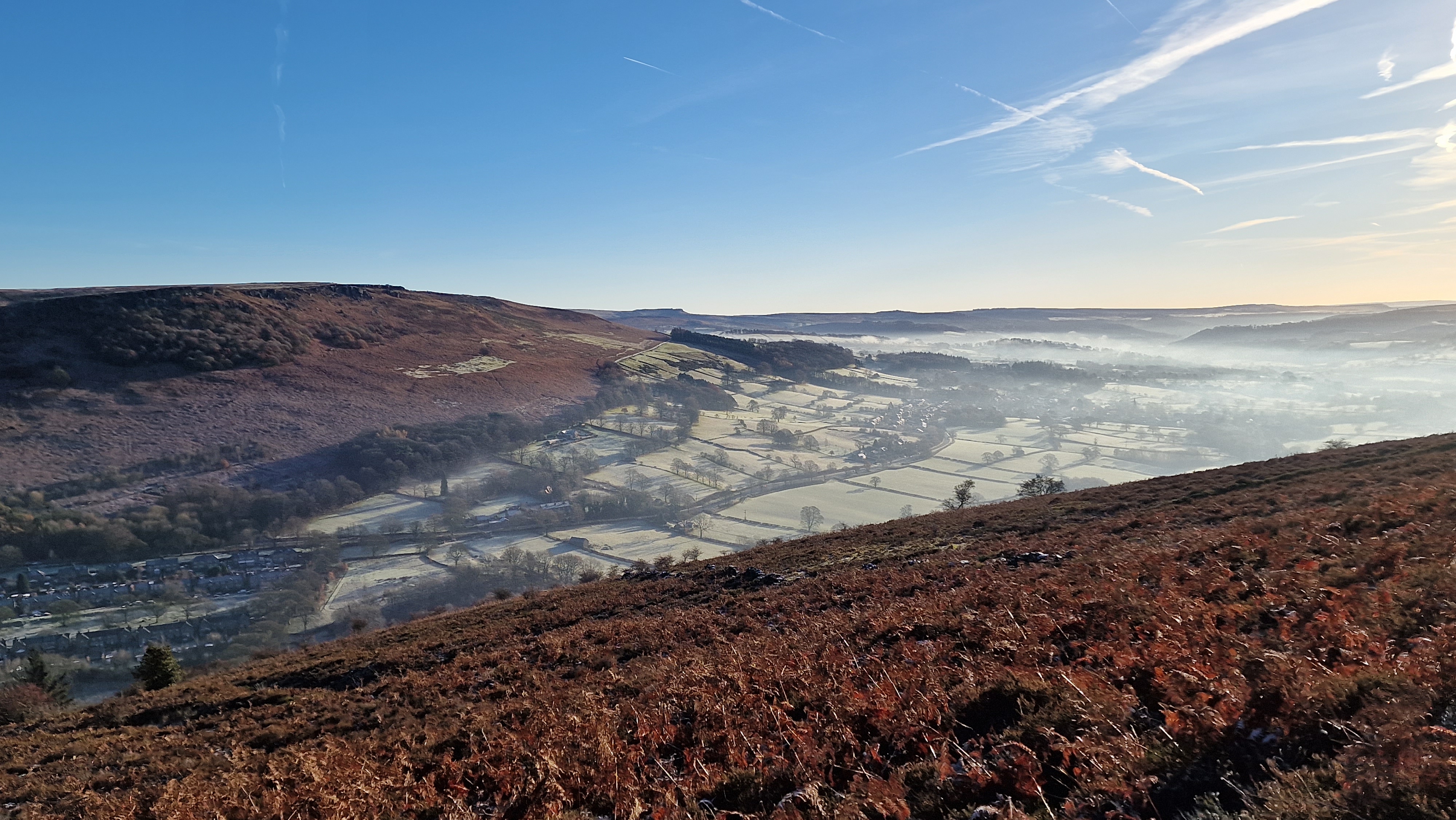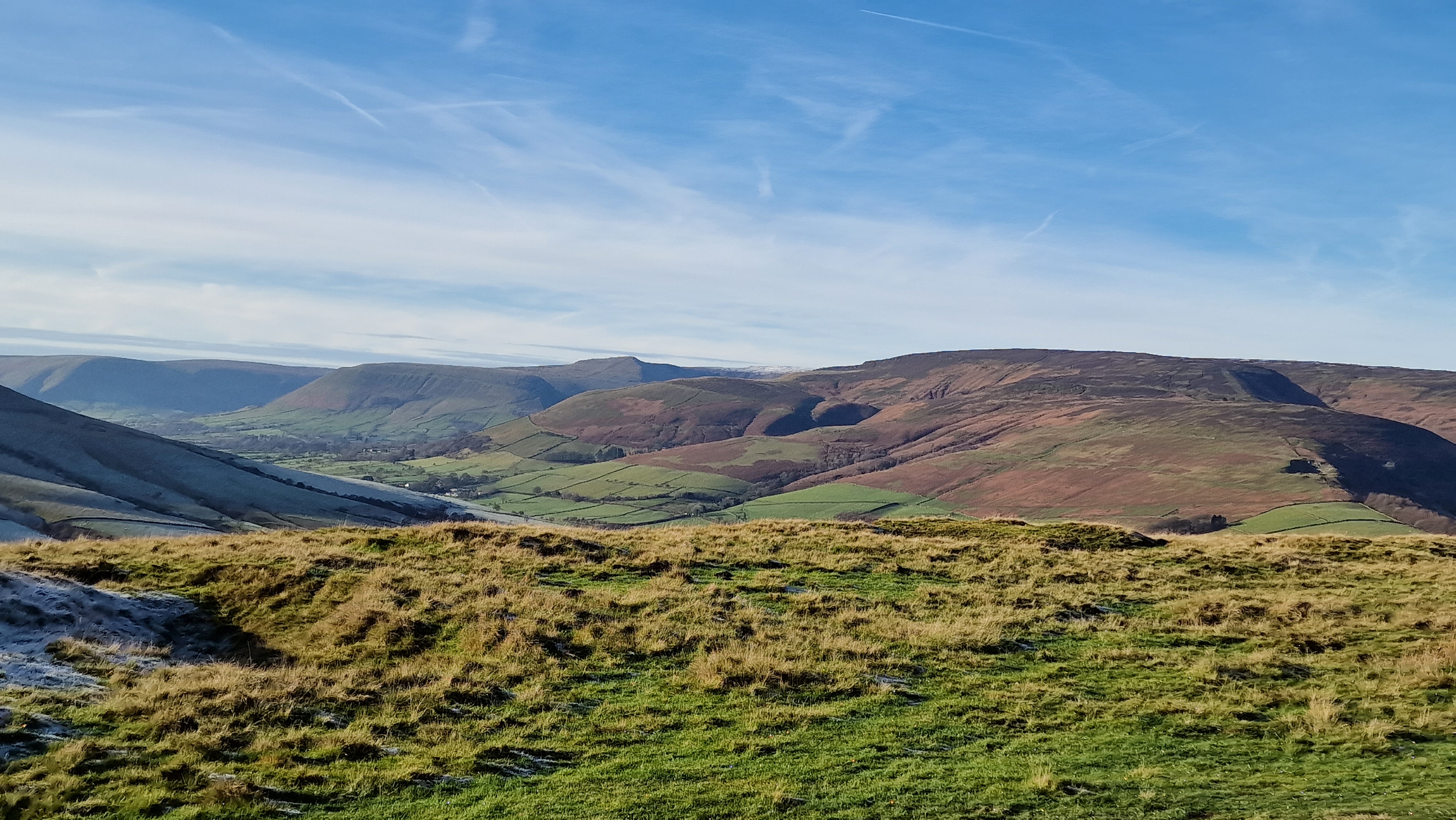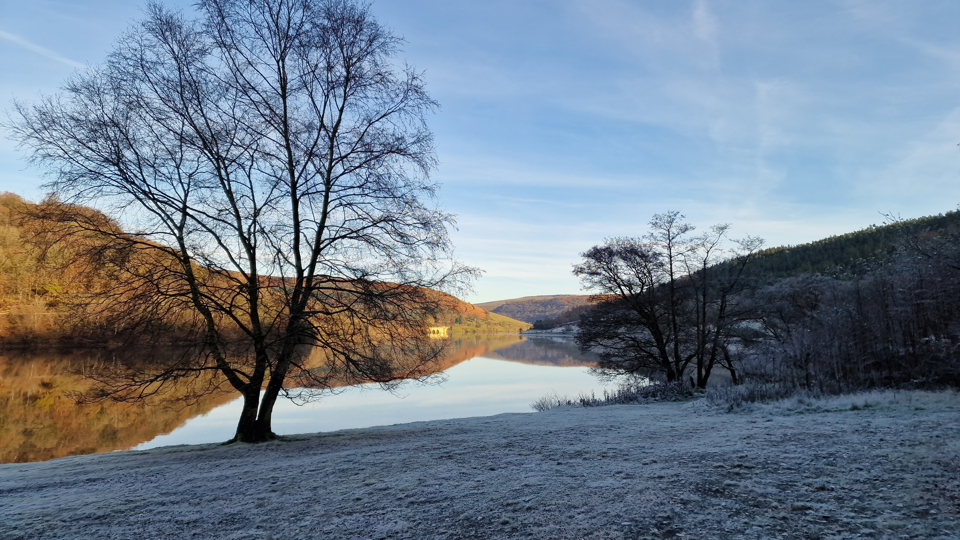 6th December 2023 A lovely cold winters day with heavy frost replacing recent snow. Rather than Parkin Clough which would have been muddy walked along the alternative, that zigzaged up to the top of Parking Clough on a good track. Great views all around once out of the wood. Again took an alternative path down from Wooler Knoll to Ladybower. Followed the obvious tracks to the botton easily but these are not all marked on the map. A great day to be out and nobody about - the only time on Win Hill summit with nobody else - a record.
