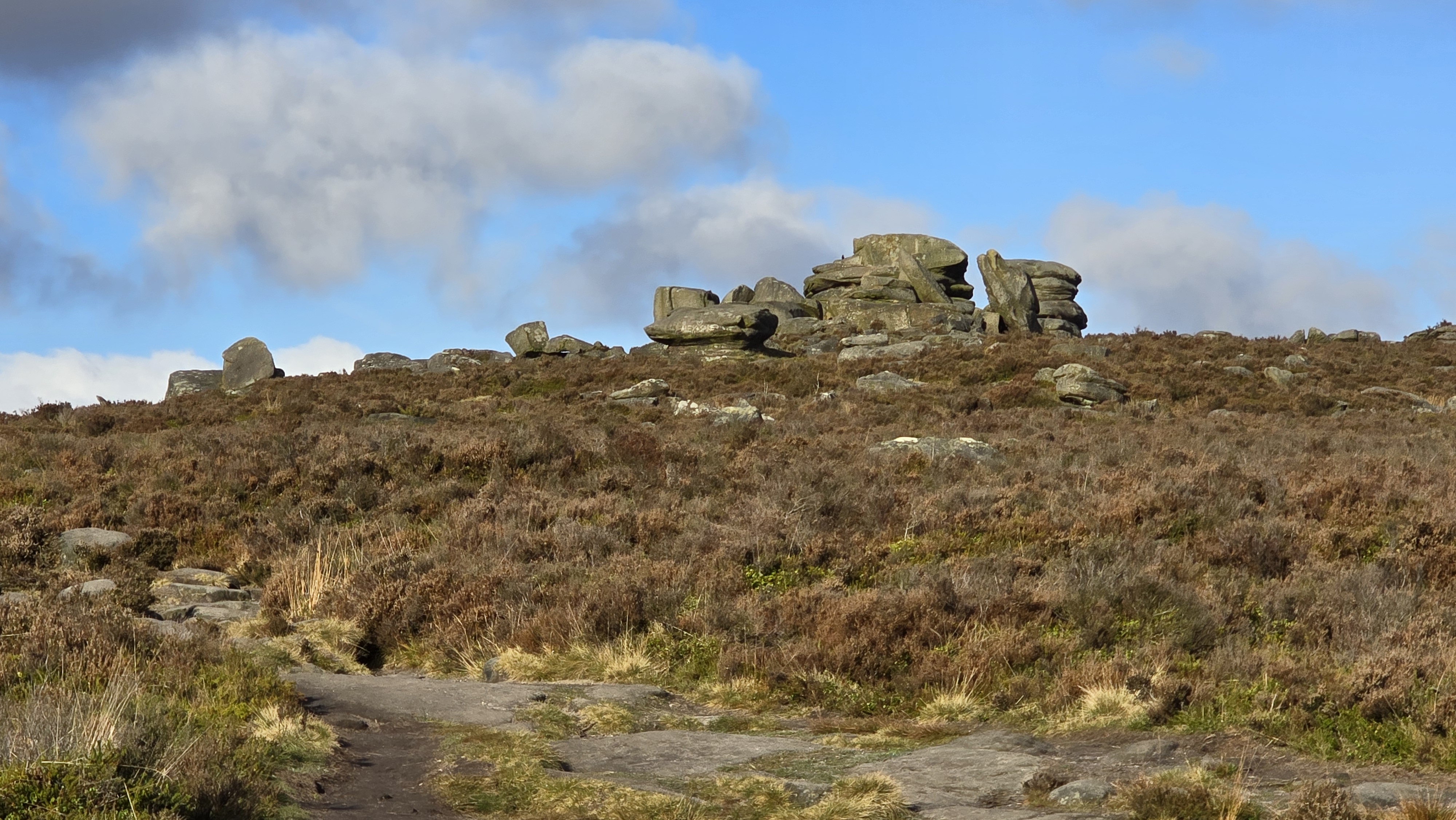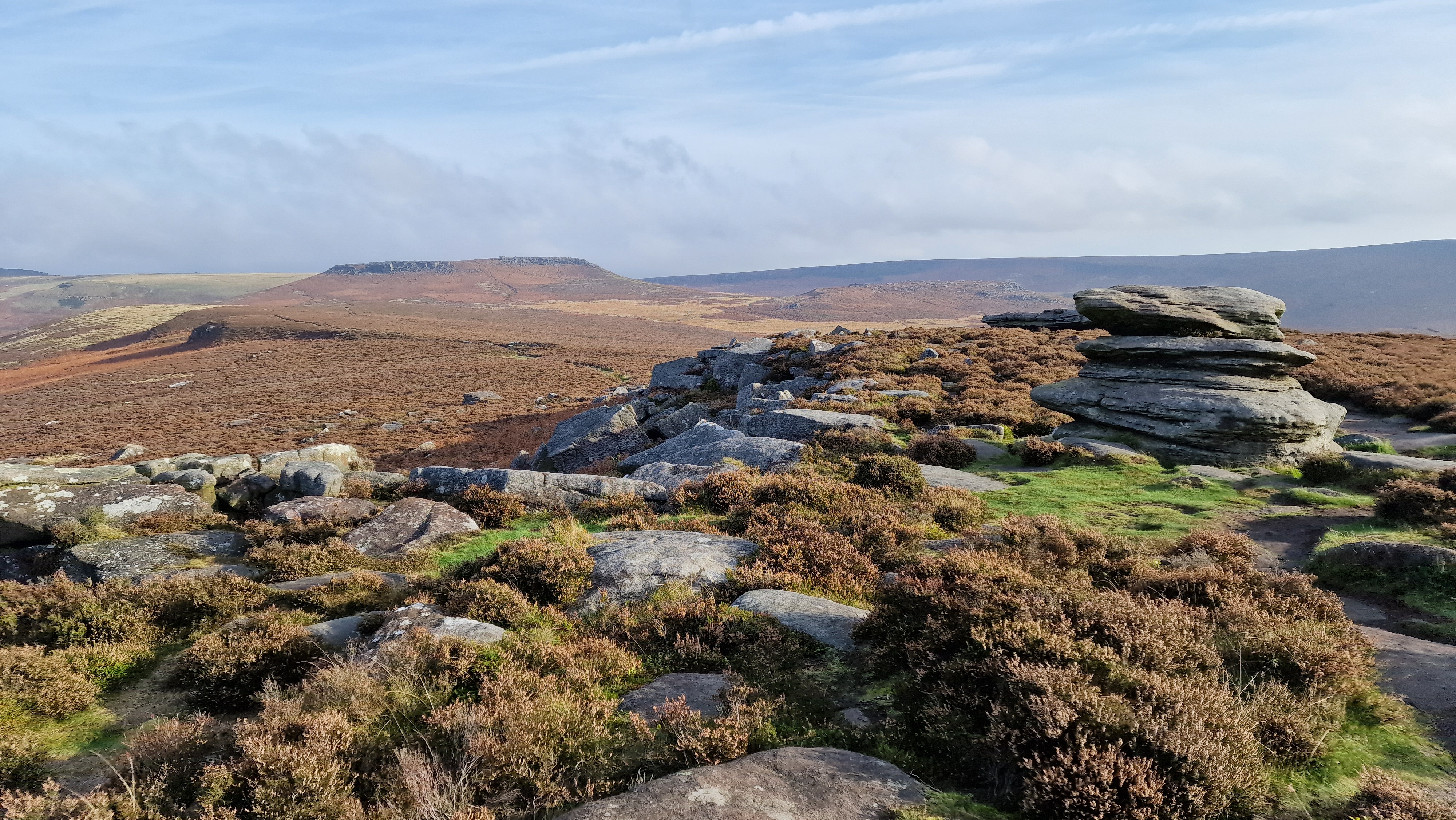 14th November 2024 For a change I walked this route clockwise rather than anti-clockwise which is described here. Autumn was nearly over but the walk down Padley Gorge was spectacular, covered in brown leaves. It was a morning walk and the sun was not shining on the rocks, the route is much better in the evening. But the walk under the rocks of Lawrencefield and Millstone was enjoyable. No rock climbers to see.