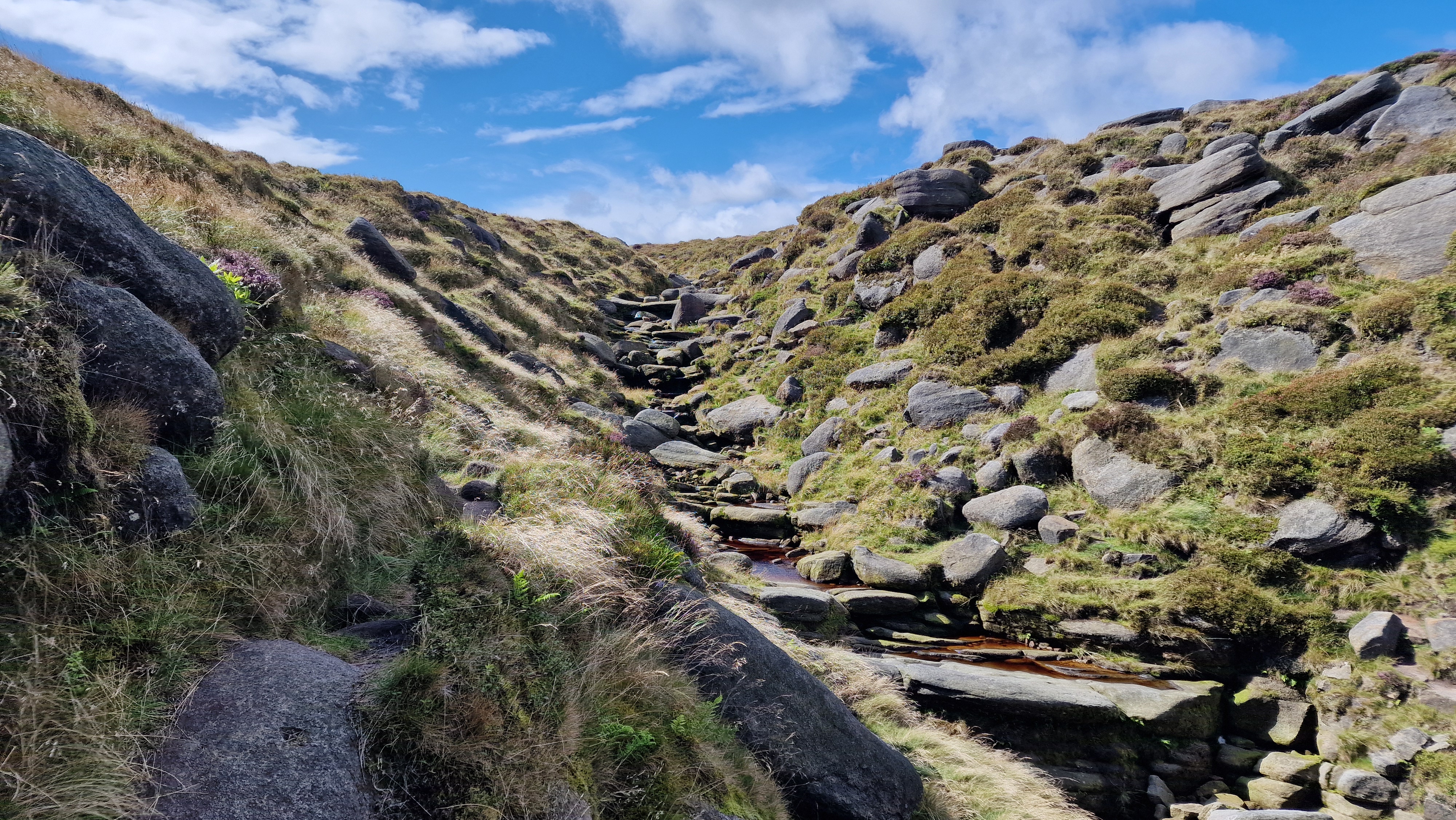 11th July 2018 I did this walk in mid July 2019, after an incredibly long dry spell so the wetness of the paths were not a concern. Indeed the peat was baked dry and there was a high fire risk in the Peak District. Major environmental improvements are taking place on Kinder and there is a fence around the plateau, with stiles at path crossings, to keep the sheep out. Despite this I saw two stray ewes the wrong side of the fence; report to the authorities