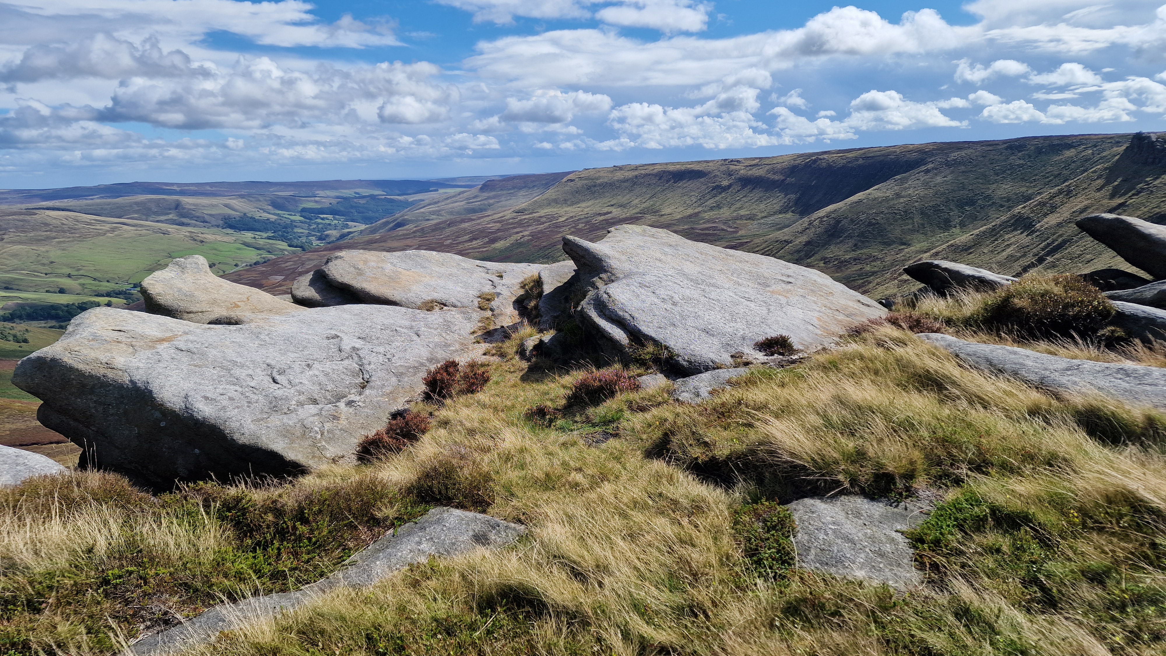 Kinder is a large flat plateau surrounded by steep edges. This walk follows the edges along the north of Kinder. These rock edges here, mark the northern limit of Kinder and create an edge with a significant drop. From here views north towards Bleaklow are extensive on days of good visibility. The return is a lovely walk down the Snake Path alongside Ashop Clough.