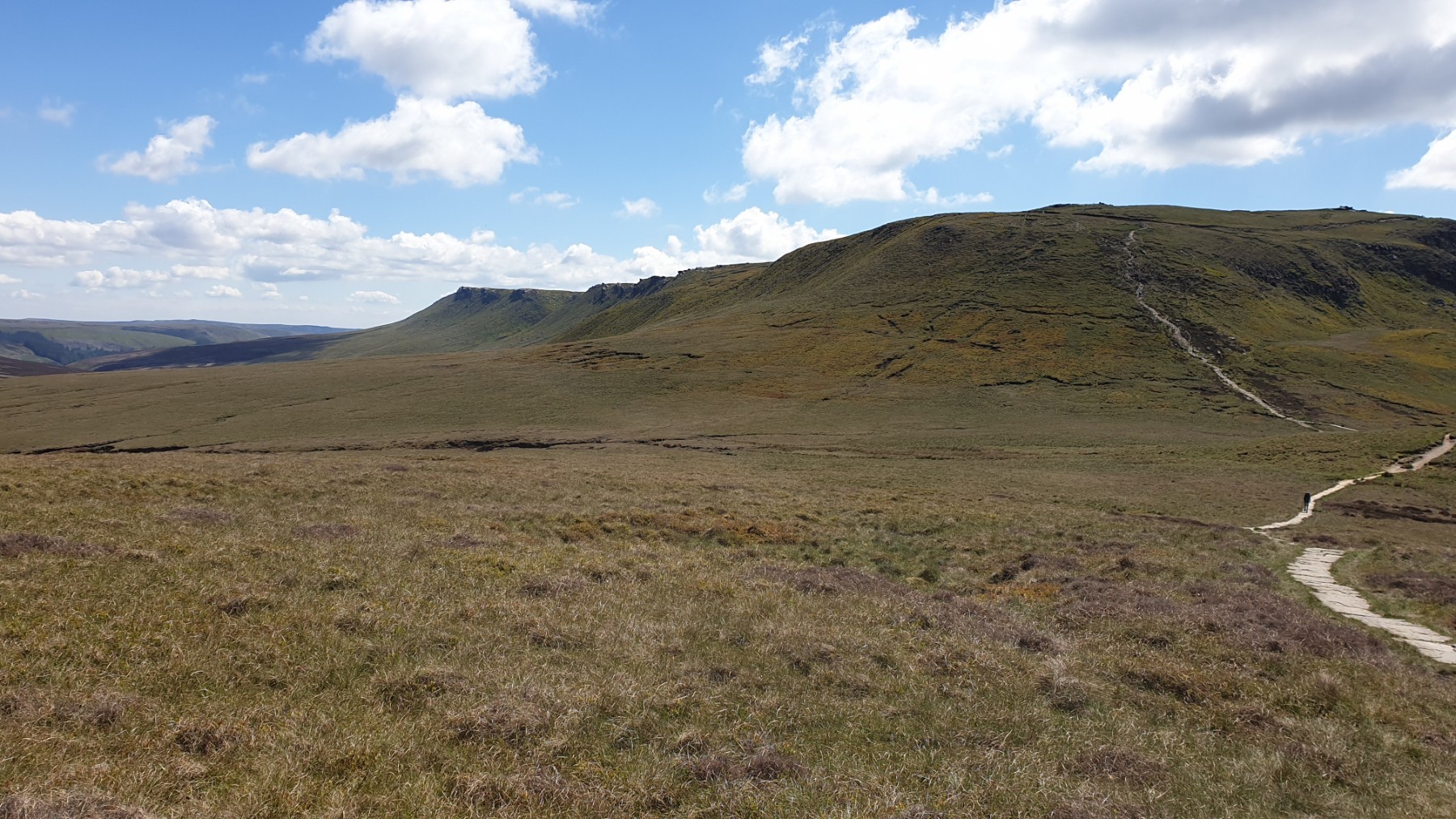 You can walk up the road to the Snake Summit, from Doctor's Gate, but best to get away from the road. Follow the well marked path up Doctor's gate until it meets the Pennine Way. From here walk south to get to the Snake Road. Cross the road and through the gate. There is a well made path (Penine Way_) all the way to Mill Hill but it is better to strike off left to get to the summit of Featherbed Moss. There is a great all around view from this summit. From here walk over the moor back to the Pennine Way and then follow the paved path all the way to the summit of Mill Hill. A relaxing walk with views of the north of Kinder. Remember to turn around to see Bleaklow over the Snake road. The top of Mill Hill is marked with a small pile of stones and a marker. One of the least impressive summits ever. (4.0kms. 140m. 1hrs. 30min.)
