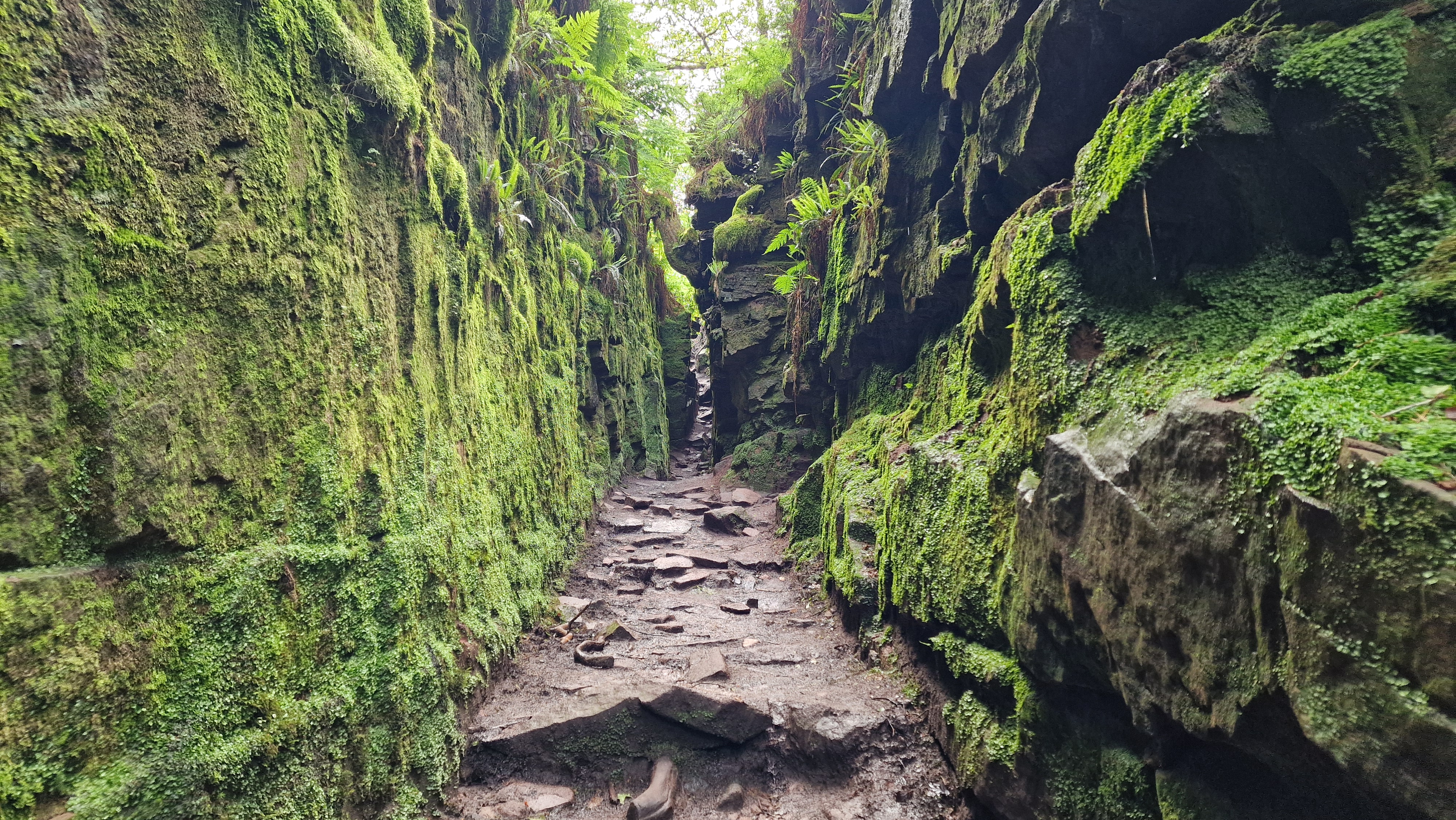 From the parking the first stage is to walk along the road to Roach End (2km). The road is not very busy and has great views over to the south west as well as The Roaches themselves. In particular, the view of the Five Clouds that are below the edge itself is impressive. Once at Roach End, Luds Church can be reached by following the signposted path through the forest, but this is a very muddy way. Better to walk along the ridge to reach the path at the wall that descends to the right to reach the Luds Church path. Once at the path follow the boardwalk to get to Luds Church. Walk carefully down the steps and then through Luds Church itself. Luds Church is a chasm in the rock which has led a 3m split with huge vertical sides covered in moss. One of the spectacular features of the Peak District. (4.0kms. 100m. 1hrs. 30min.)