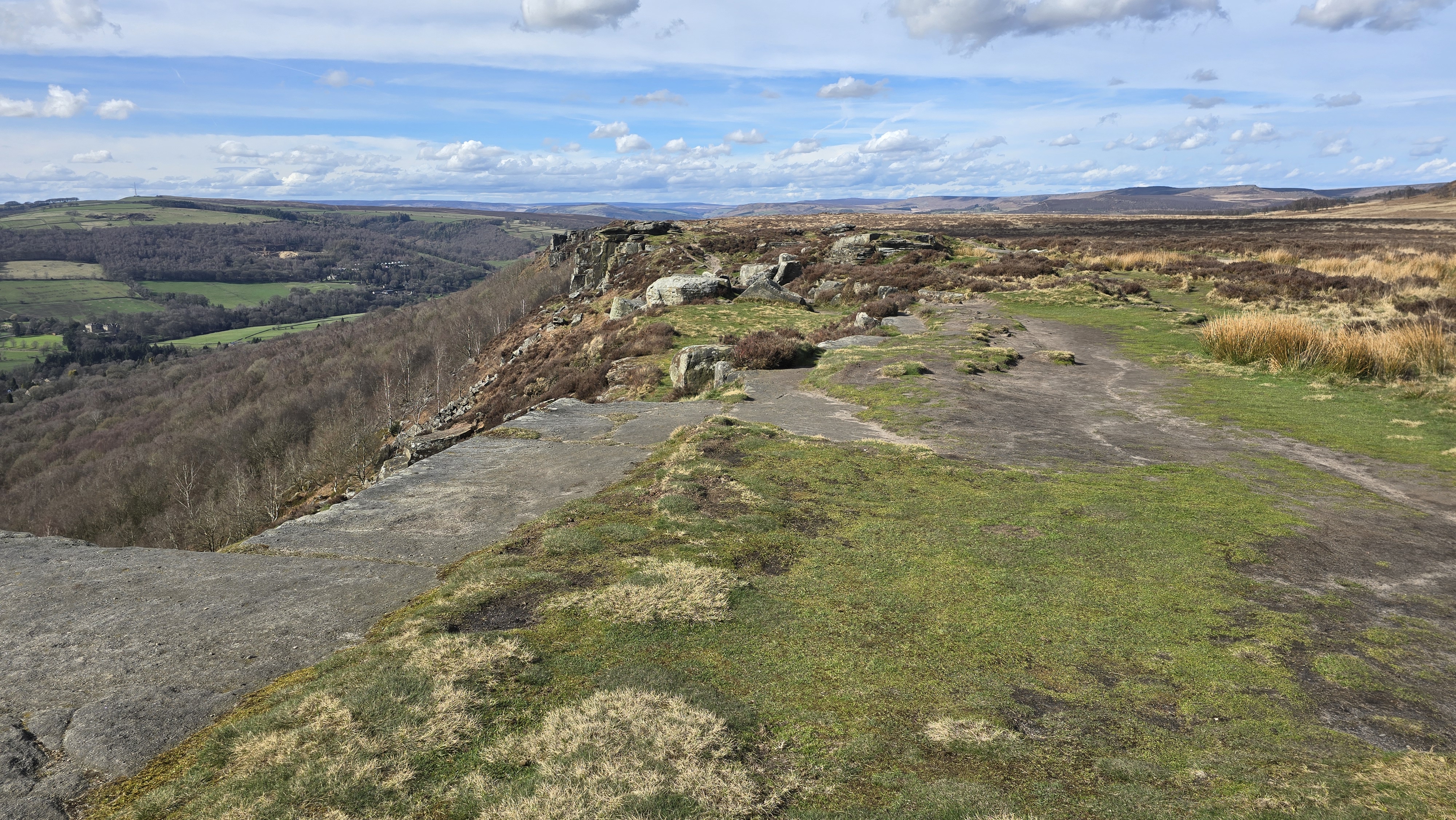 Curbar Edge Next. This part of the route follows the path along Curbar Edge. From the road, crossing with care, take the definite path around the west side of the car park and then onto the moor. Follow the significant path here that is again set back some 20m or so from the main edge. This path is continued until the obvious dip between Curbar and Froggatt edges is. Whilst walking there are some great views of Curbar edge, and later on views of Froggatt edge; not forgetting the views further away. (2.5kms. 50m. 0hrs. 50min.)